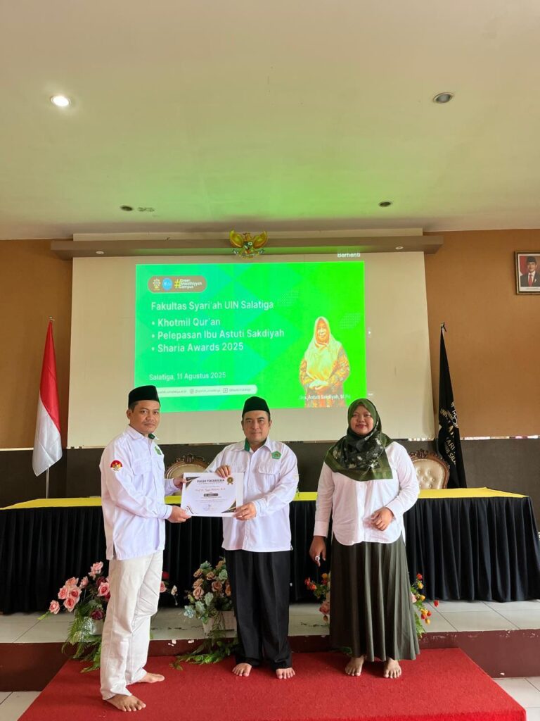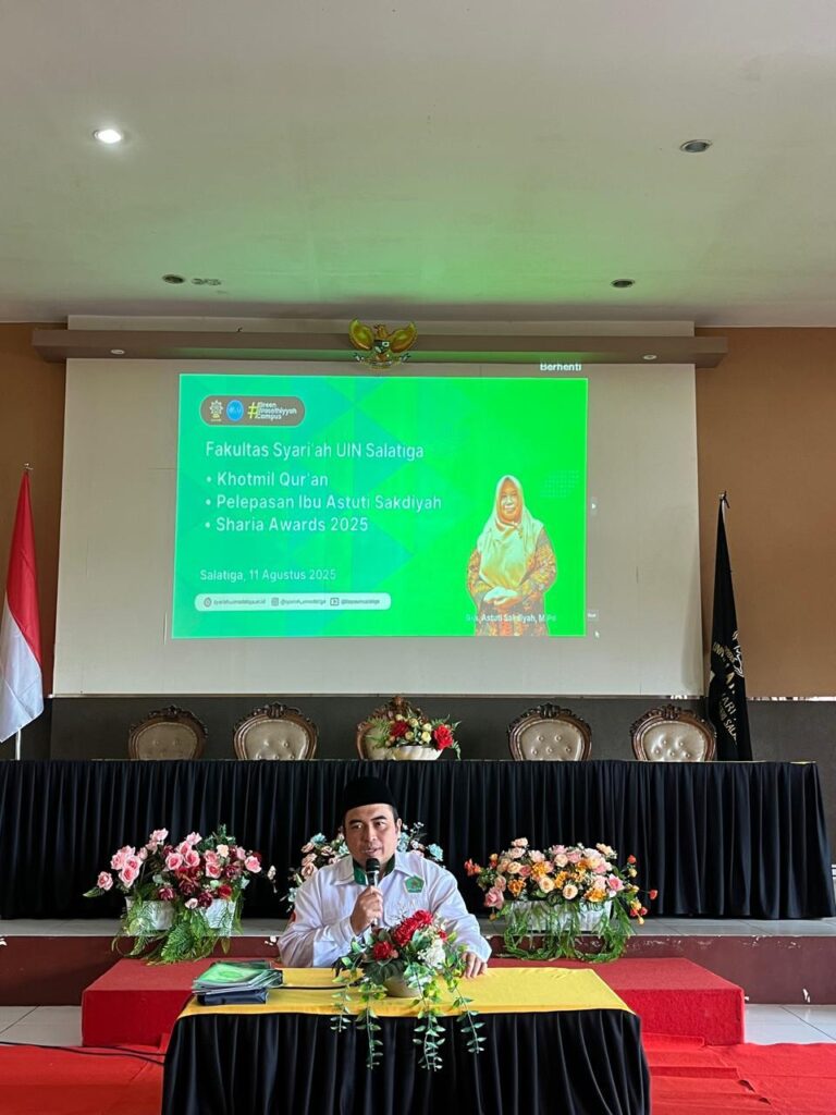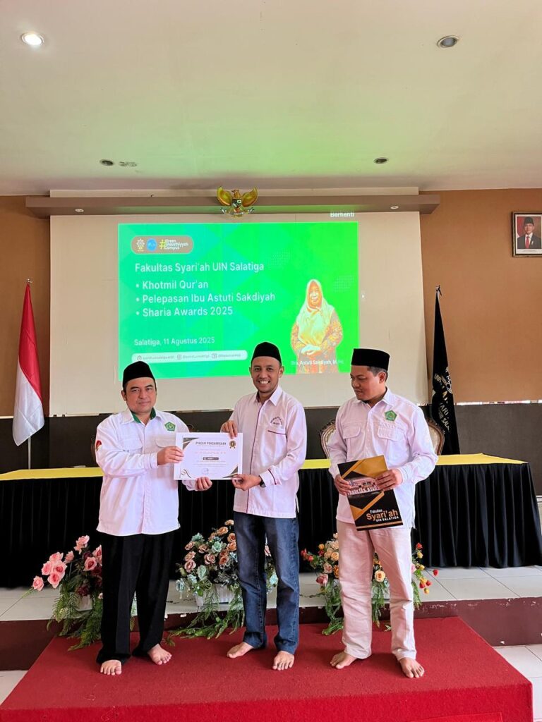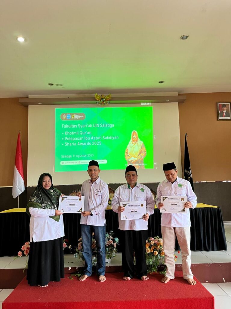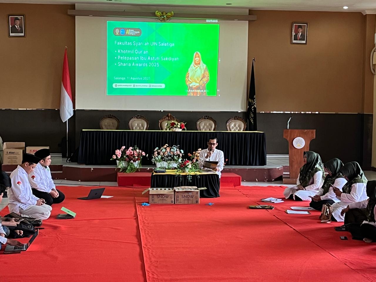 Salatiga, (11/08/2025)- Fakultas Syariah menggelar Shariah Awards 2025, sebuah ajang apresiasi bagi dosen dan mahasiswa berprestasi yang aktif dalam kegiatan akademik maupun nonakademik. Acara ini berlangsung di Aula Lantai 3 Gedung Dekanat Fakultas Syariah, bertepatan dengan prosesi pelepasan purna tugas Ibu Dra. Astuti Sakdiah, M.Pd.