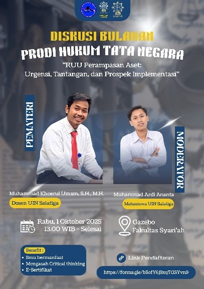 Salatiga, (01/10/2025) – Program Studi Hukum Tata Negara (HTN) Fakultas Syari’ah UIN Salatiga kembali menyelenggarakan kegiatan Diskusi Bulanan sebagai ruang akademik untuk memperkaya wawasan mahasiswa. Pada edisi bulan ini, diskusi mengangkat tema “RUU Perampasan Aset: Urgensi, Tantangan, dan Prospek Implementasi” yang dilaksanakan di Fakultas Syari’ah pada Rabu, 01 Oktober 2025. Diskursus ini terbuka untuk publik, tidak terbatas hanya mahasiswa Hukum Tata Negara Fakultas Syariah UIN Salatiga saja, melainkan lintas jurusan serta masyarakat umum bisa hadir dalam diskursus yang diselenggarakan HMPS HTN Fakultas Syariah UIN Salatiga.