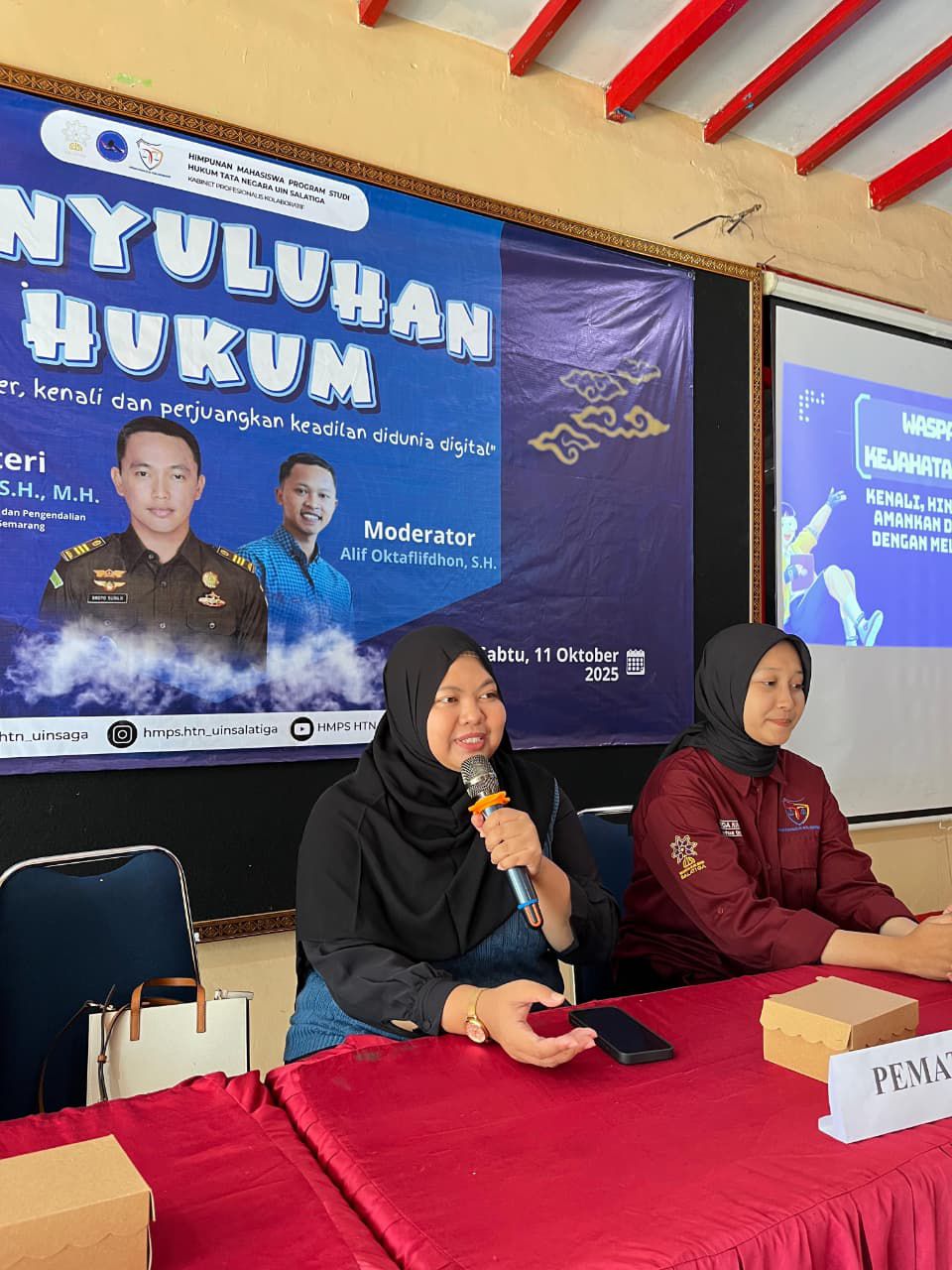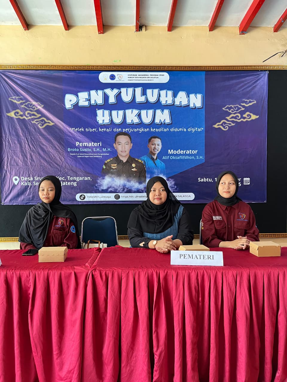 Salatiga, (11 Oktober  2025) – Himpunan Mahasiswa Program Studi (HMPS) Hukum Tata Negara Fakultas Syari’ah UIN Salatiga sukses menyelenggarakan kegiatan Penyuluhan Hukum dengan tema “Melek Siber: Kenali dan Perjuangkan Keadilan di Dunia Digital”. Kegiatan ini berlangsung di Balai Desa Sruwen, Kecamatan Tengaran, Kabupaten Semarang, dan dihadiri oleh warga masyarakat setempat, tokoh desa, serta pelajar dan mahasiswa.