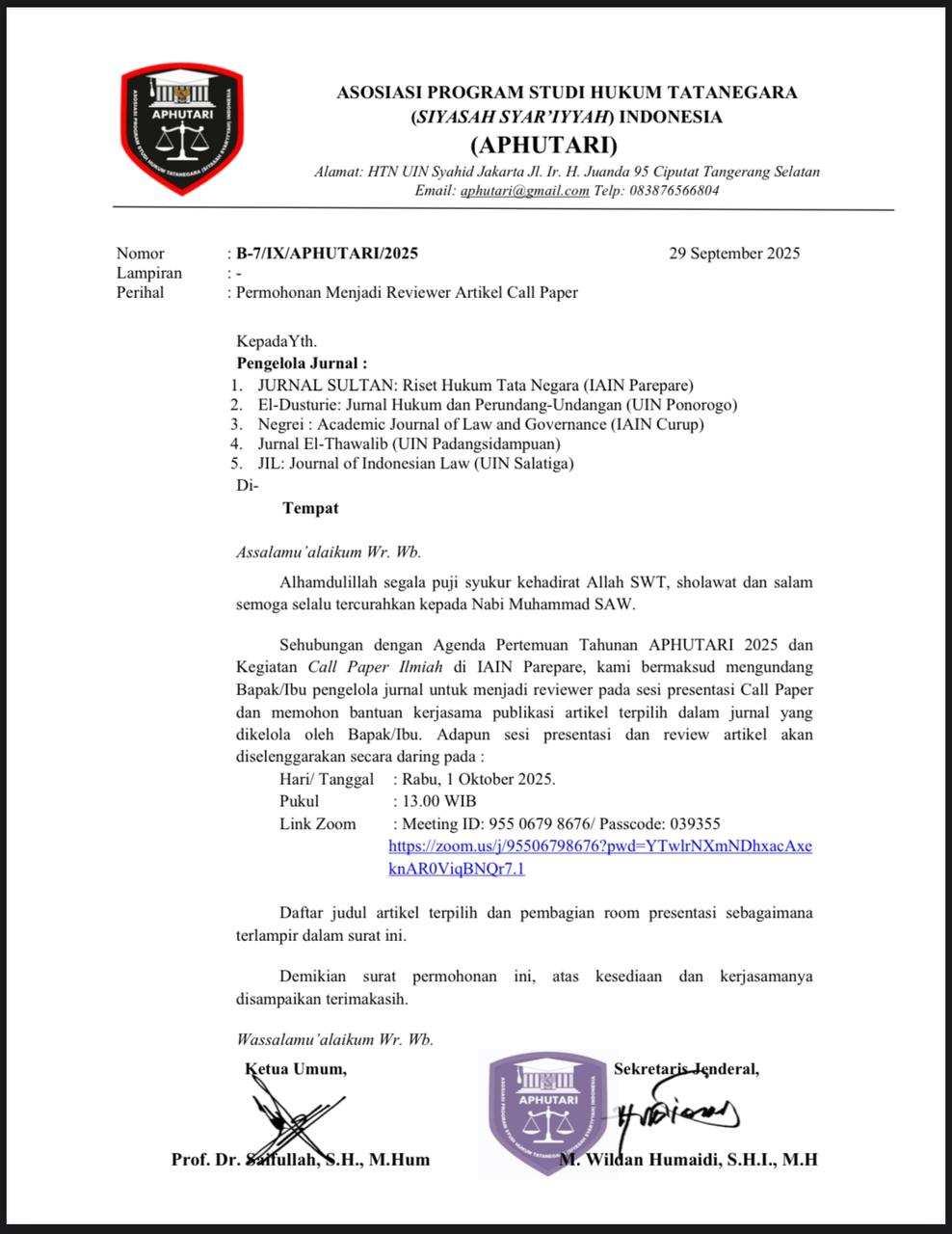 Salatiga, (01/10/2025)- Dalam rangka memperkuat budaya akademik di lingkungan Perguruan Tinggi Keagamaan Islam Negeri (PTKIN), Asosiasi Program Studi Hukum Tata Negara PTKIN se-Indonesia (APHUTARI) menyelenggarakan Konferensi Nasional Hukum Tata Negara pada Rabu, 1 Oktober 2025, yang salah satu agendanya adalah sesi Call For Paper. Kegiatan ini dilaksanakan secara daring melalui Zoom Meeting, dan melibatkan akademisi dari berbagai kampus di Indonesia.
