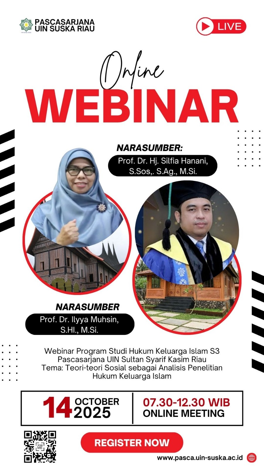 Prof. Dr. Jumni Nelli, M.Ag. Kepala Prgram Studi Doktoral S3 Hukum Keluarga Islam UIN Suska Riau menjelaskan bahwa webinar ini merupakan bagian dari Upaya Pascasarjana UIN Suska Riau dalam meningkatkan kualitas Penelitian dan Akademik, Khususnya bagi Mahasiswa Program Studi S3 Hukum Keluarga Islam. Selain itu, kegiatan ini menjadi forum diskusi ilmiah yang terbuka bagi berbagai kalangan akademisi.