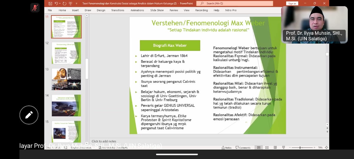 Salatiga, (14/10/2025)- Dekan Fakultas Syariah UIN Salatiga, Prof. Dr. Ilyya Muhsin, S.H.I., M.S.I berkesempatan mengisi webinar yang diselenggarakan Prodi Hukum Keluarga Islam S3 UIN Sultan Syarif Kasim Riau bertema “Teori-teori Sosial sebagai Analisis Penelitian Hukum Keluarga Islam.” Webinar ini dilaksanakan pada Selasa, 14 Oktober 2025 melalui via Zoom dihadiri lebih dari 150 pesera dari berbagai kalangan akademisi. Selain Prof. Ilyya, ada juga narasumber Rektor Universitas Islam Negeri Sjech M. Djamil Djambek Bukittinggi Prof. Dr. Silfia Hanani, S.Sos., S.Ag., M.Si.