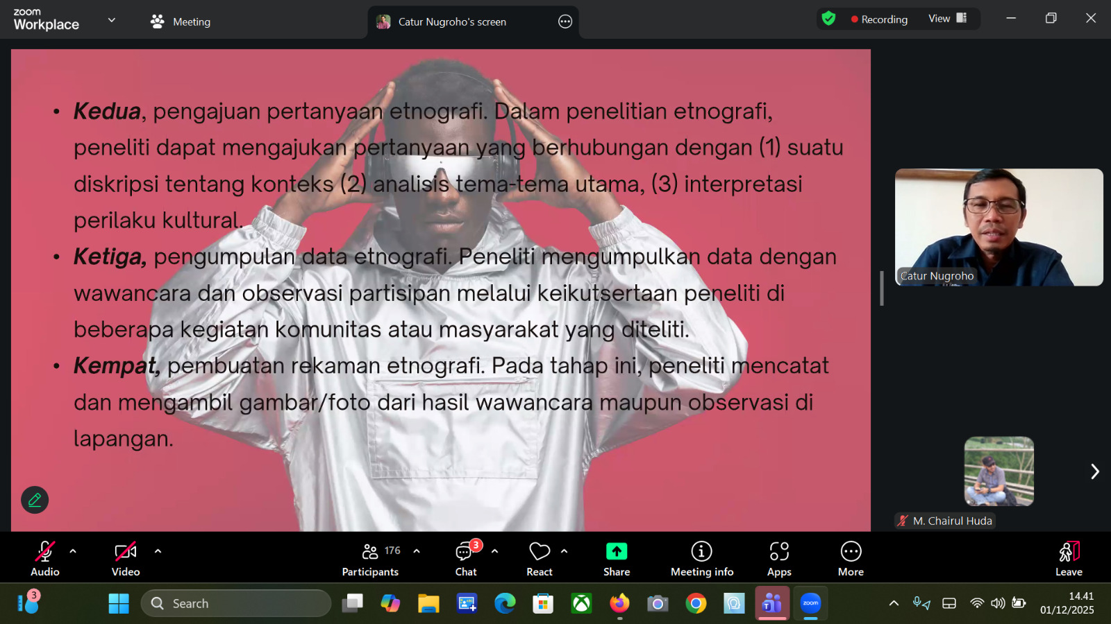 Sementara itu, Dr. Catur Nugroho menyampaikan materi mengenai Virtual Ethnography, yaitu metode penelitian yang mengkaji perilaku masyarakat di ruang digital. “Penelitian etnografi memiliki dua karakteristik, yaitu deskriptif padat dan kritikal,” jelasnya. Lebih lanjut, Dr. Catur Nugroho mengatakan, Etnografi Virtual atau Netnografi adalah pendekatan penelitian kualitatif baru yang mengadaptasi teknik etnografi untuk studi budaya dan komunitas yang muncul dalam komunikasi yang dimediasi komputer (computer mediated communication) dan komunikasi yang dimediasi media sosial (social mediated communication), jelas pakar cultural studies ini.
